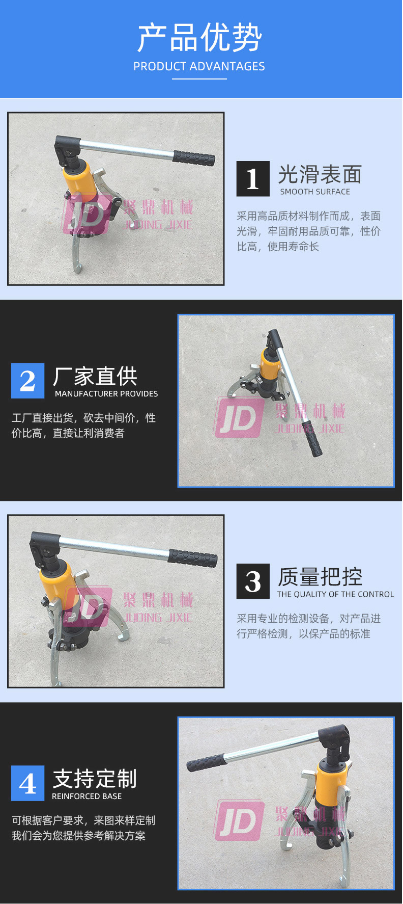 液壓拉馬是以液壓起動桿直接前進移動,故推動桿本身不作轉動。鉤爪座又可隨螺紋直接作前進后退之調距,操作時只要把手前后小幅度擺動,油壓起動桿前移,鉤爪相對應后退,把被拉物體拉出。